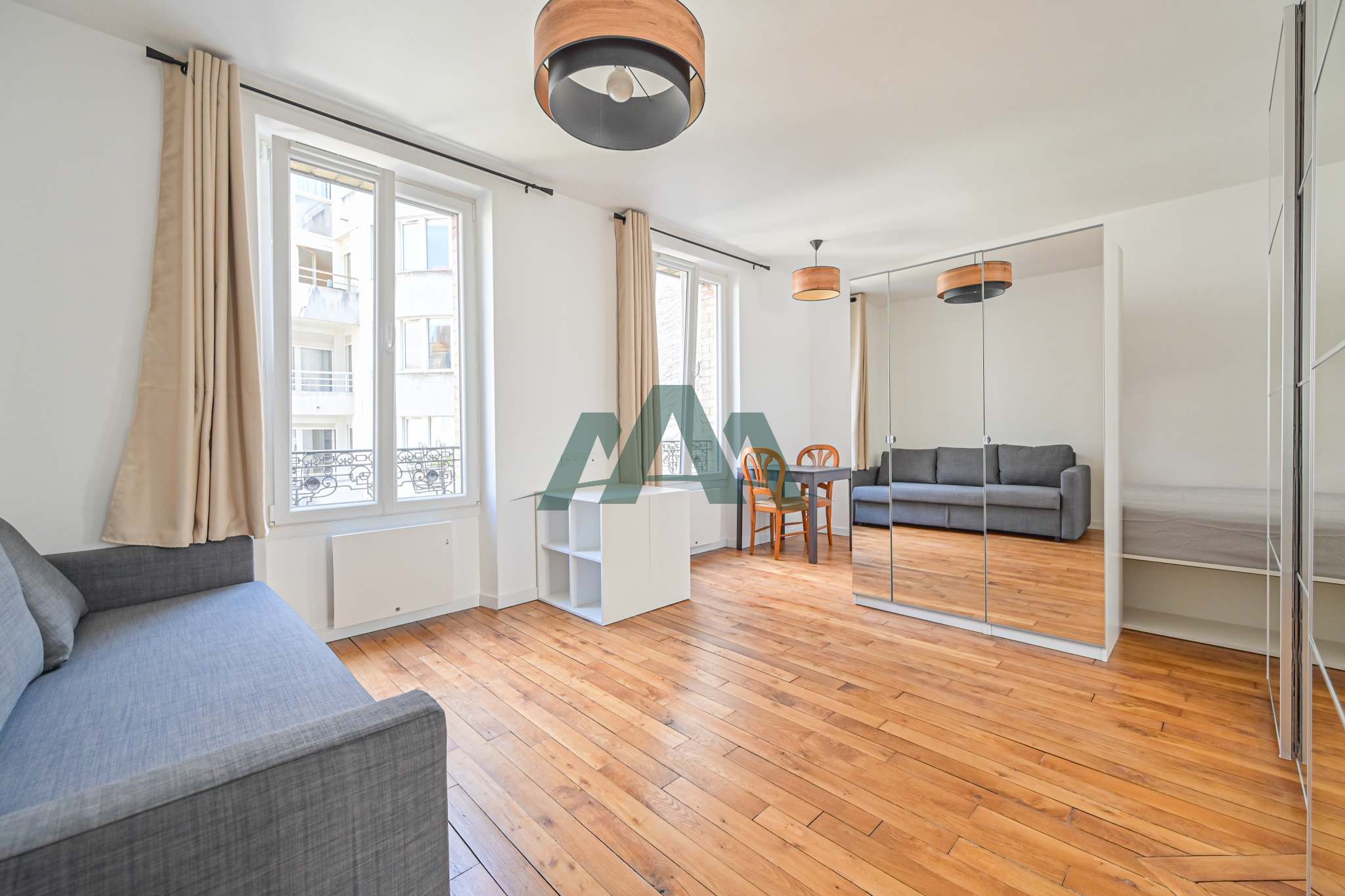 - une pièce principale avec double espace (séjour + coin nuit séparé par armoire), comprenant canapé-lit, lit double, table à manger, chaises et nombreux rangements
